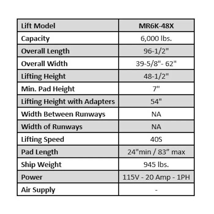 Are you tired of shopping around and finding only high prices or cheap, inferior products? If you are, then you're like many other customers we've satisfied with the ASEplatinum Lifts. ASEplatinum lifts are an affordable alternative to the high priced manufacturers out there, yet are surprisingly high quality. They basically took all the best features that customers want, and combined them with attention to detail along with rock-bottom prices to win your business. You don't have to sacrifice quality for an affordable garage lift.IMPROVED DESIGN!! The MR6K-48X now has longer adjustable radius arms - 5 inches longer per arm!!