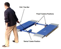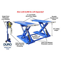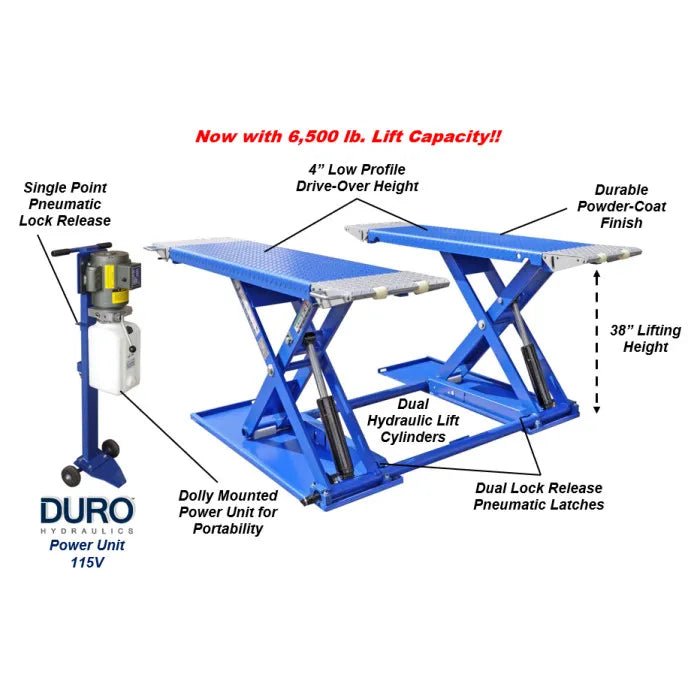 The MR6.5K-38 is a portable 6,500 lb. hydraulic mid-rise scissor frame lift, equipped with twin hydraulic cylinders, pneumatic single point / double lock release system desiged to lift cars & light trucks to a comfortable working height of 38". The lift comes standard with load bearing flip-up runway extensions, rubber spacer blocks, along with a power unit dolly, lift wheel kit & tow bar for convenient portability feature. The improved MR6.5K-38 lift now includes an additional weight capacity of 500 lbs. along with 'flat top' platforms as part of the improved design. The improved MR6.5K-38 is built for years of trouble-free service for brake work, wheel service, inspections & detailing applications.