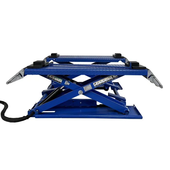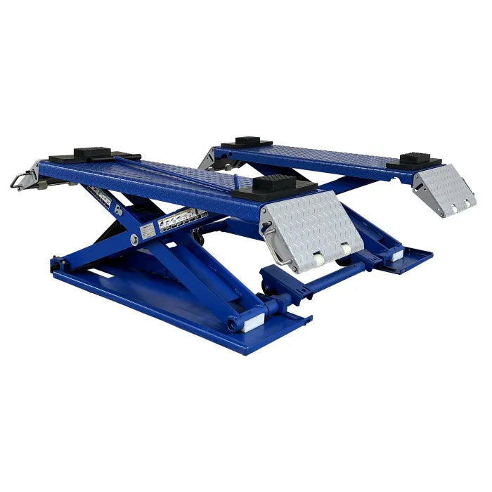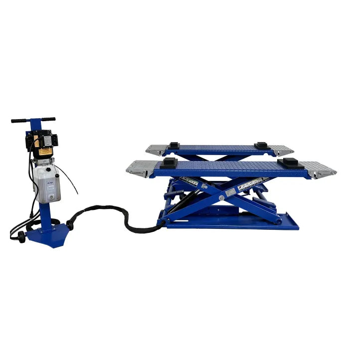 The MR6.5K-38 is a portable 6,500 lb. hydraulic mid-rise scissor frame lift, equipped with twin hydraulic cylinders, pneumatic single point / double lock release system designed to lift cars & light trucks to a comfortable working height of 38". The lift comes standard with load bearing flip-up runway extensions, rubber spacer blocks, along with a power unit dolly, lift wheel kit & tow bar for convenient portability feature. The improved MR6.5K-38 lift now includes an additional weight capacity of 500 lbs. along with 'flat top' platforms as part of the improved design. The improved MR6.5K-38 is built for years of trouble-free service for brake work, wheel service, inspections & detailing applications. ASEplatinum manufactures several different styles of automotive scissor lifts, designed to offer the technician or home garage hobbyist the ability to service the car without having to set it up on jacks and jack stands. Models include mid rise lifts which allow access to wheels and brakes for service, as well as low rise pad lifts and full service scissor alignment racks. Some models even offer the feature of being portable. And because they're made by ASEplatinum, you'll never have to worry about parts availability. Call us at Automotive Service Equipment today.