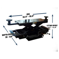 The ASEplatinum SJ-35 Sliding Jack is an affordable sliding bridge jack designed to be mounted on a four post lift's runways. Runway mounting is versatile making this jack great for many brands while maintaining a low profile design. Manual pump operation eliminates the need for air which is perfect for the home enthusiast. The scissor design allows for level, wheels free lifting to make your four post lift complete. Rests on the runways. Can adjust to fit runways from 37.5" to 44" apart. Arms can be adjusted from 34" out to 60" to reach vehicle frame jacking points. For use with any of the ASEplatinum home / hobbyist four post lifts.